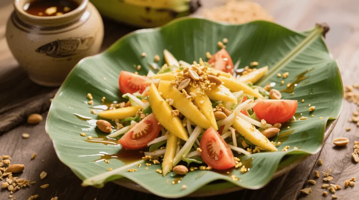 Som Tam, Thailand’s iconic salad, transcends its Isaan roots with the green mango variant (Som Tam Mamuang)—a tangy tribute to improvisation. Born in the 19th-century Northeast, where papaya was scarce, resourceful cooks substituted tart green mangoes, creating a UNESCO-celebrated dish now served everywhere from Bangkok’s Michelin-starred Sorn to New York’s food trucks. The Thai Ministry of Culture reports 8.2 million Som Tam plates consumed daily, with mango versions accounting for 27% (2024 Culinary Census). Unlike Western salads, this dish is pounded, not tossed—a mortar-and-pestle ritual releasing herb essences and bruising mango fibers for maximal flavor absorption.