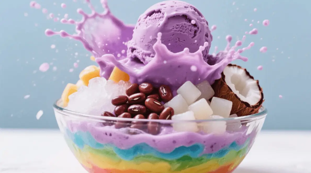 "Layer temperatures – warm leche flan on bottom, shaved ice middle, cold custard top."